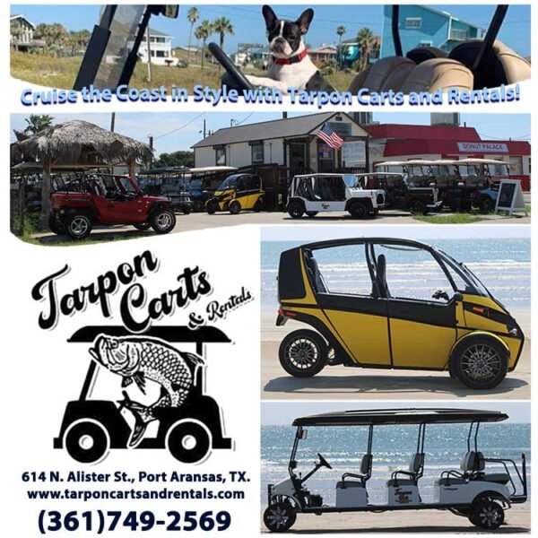 Tarpon Carts & RentalsBy the_admin / April 3, 2026 Tarpon Carts & Rentals 614 N. Alister St., Port Aransas, TX, 78373 (361) 749-2569 MAP Beach Cart Rentals – Electric Bikes – Electric Scooters – Beach Chairs – Tents – Umbrellas Beach Rentals Beach Cart Rentals Electric Bikes Electric Scooters Beach Chairs Tents Umbrellas Contact This Business Your Name Your Email Your Message Send Message